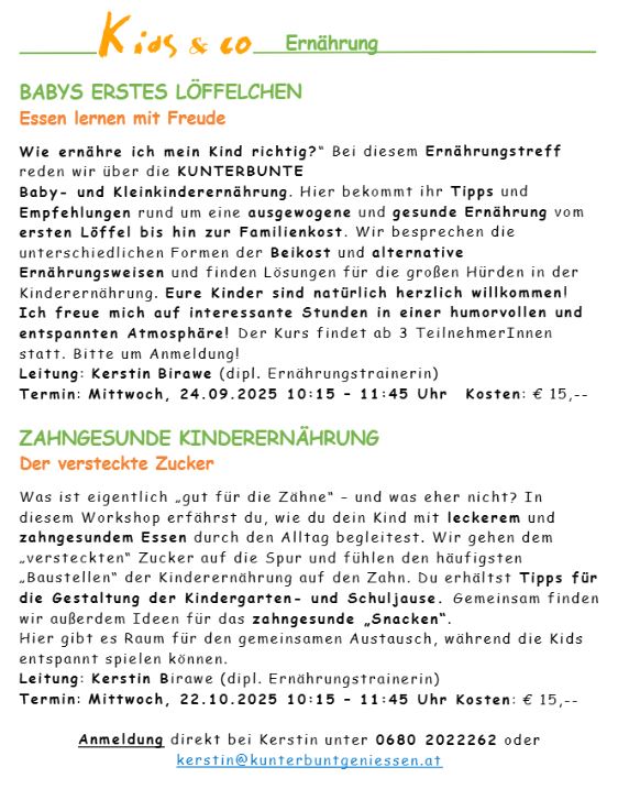 Wenn du gerne mehr über die Baby- und Kinderernährung wissen möchtest, bist du hier richtig! Bei unseren Ernährungstreffs bekommst du Infos und Tipps für Babys 1. Löffelchen bis hin zur Gestaltung der Kindergarten- und Schuljause.